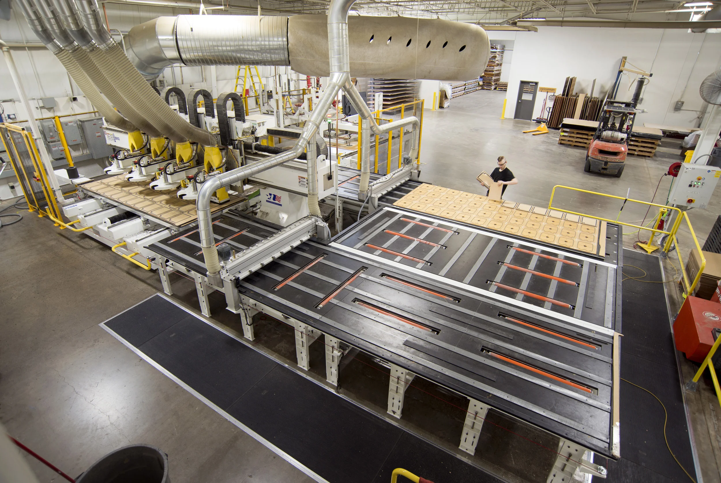 Full sheets move from the warehouse to the machine floor to be cut into product parts on a CNC machine.